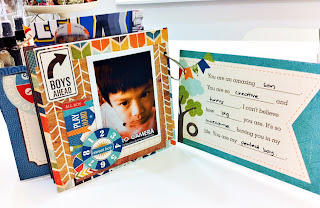 I decided to challenge myself using limited supply and create an album for my son. The papers used is from Echo Park, All About A Boy together with their Element Stickers. Additional items is white paper bag, transparencies, buttons and washi tape.